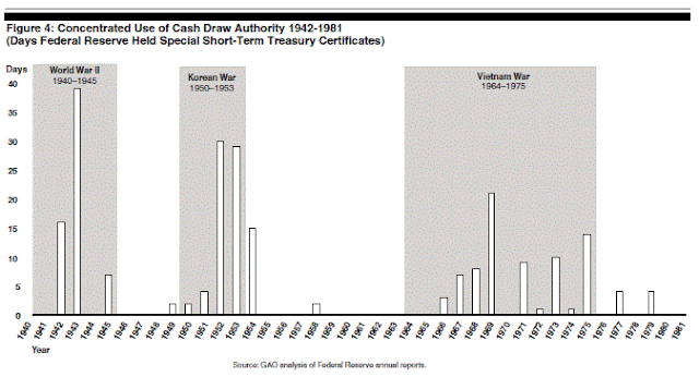 Intermittently between 1942 and 1981, Treasury was able to directly sell (and purchase) certain short-term obligations to (and from) the Federal Reserve in exchange for cash. Congress first granted this cash draw authority temporarily in 1942, allowed it to lapse several times, and extended it 22 times until 1979, when it modified some of the terms and added controls.We also learn from the GAO document that in 1981 Congress allowed the overdraft authority – referred to as "draw authority" – to permanently expire. Thus ended 39 years of Treasury overdrafts. The GAO report provides some interesting statistics on this period. Between 1942 and 1981, the Federal Reserve held Treasury certificates purchased directly from the Treasury on just 228 days, mostly during times of war. So while overdrafts were permitted, they weren't used often, and not for long periods of time. The largest amount of certificates issued by the Treasury to the Fed on a single day was $2.6 billion in 1979. By 1979, $2.6 billion didn't amount to much, but in 1942, with the Fed's liabilities amounting to $25 billion, an extension of a $5 billion overdraft would have dramatically increased the Fed's balance sheet.