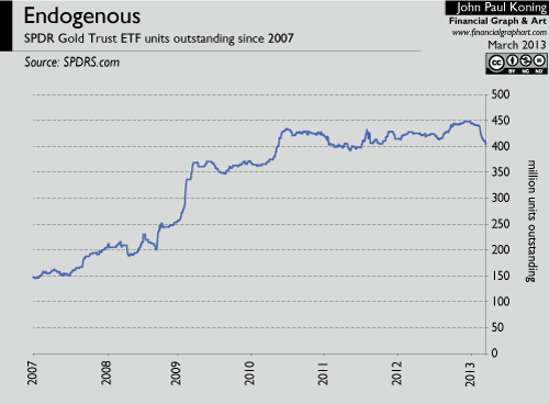 Also found on stock markets are exchange-traded funds, or ETFs. Unlike stocks, though, I would say that ETFs are thoroughly endogenous financial instruments. Take the SPDR Gold Trust ETF. When investor demand for the Gold Trust heats up, ETF units will trade at a premium to their implied gold value. Large authorized-participants buy units from the ETF originator at par, paying with gold, and then sell these blocks to the public until the premium has disappeared. Vice versa when GLD units are at a discount to their real gold value. Now the authorized-participants buy units from the public at a depressed price and sell them to the ETF originator at par for gold. The result is that the quantity of outstanding units fluctuates quite widely, as the chart shows, but the price, specifically the premium/discount, stays constant. The public, through the intermediation of authorized-participants, sucks out whatever quantity of ETF units from the issuer that it desires, and then refluxes unwanted units back to it.