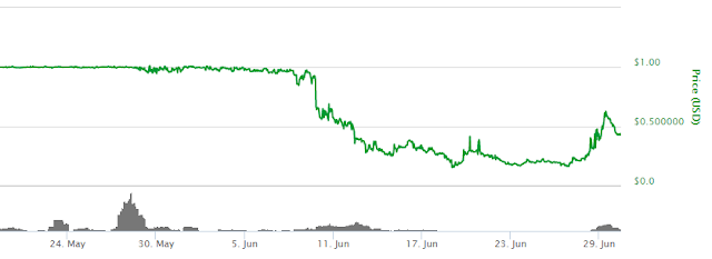 Back in September 2014 a developer going by the pseudonym JordanLee set out on a brave attempt at pegging a cryptocurrency, NuBits, to the U.S. dollar. The $1 peg lasted for around twenty months before falling in late May to 95 cents and outright failing on June 8. See the chart below.