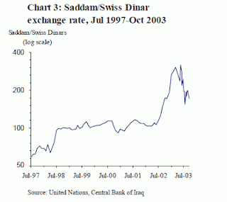 Below is the long-term price of Somali shillings, which I've snipped from Luther's paper. You can see how the purchasing power of a 1000 shilling note has fallen to what Luther calculates to be the cost of producing a new banknote, around 4 cents. His chart goes up to 2013, but if you look at the IMF's most recent report on Somalia (see Figure 3) you'll see that the exchange rate hasn't moved much.